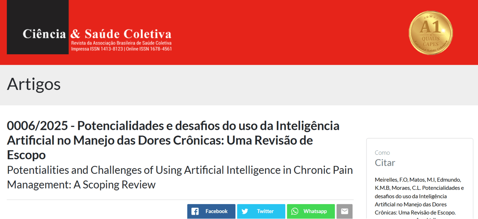 Publicado na Revista Ciência e Saúde Coletiva (QUALIS CAPES A1) em janeiro de 2025, este é um dos estudos que fizeram parte da minha Tese de Doutorado defendida no ano passado. Foi uma grande surpresa encontrar, já em 2023, uma quantidade tão grande de estudos sobre Inteligência Artificial em Dores Crônicas. Este fato, por si só, já nos demonstra que a tecnologia está sendo, cada vez mais, estudada e utilizada na área da saúde. Fizemos uma grande revisão de escopo, com 109 artigos incluídos, sendo até agora a maior revisão já publicada sobre o tema no mundo. Vou colocar o link abaixo.